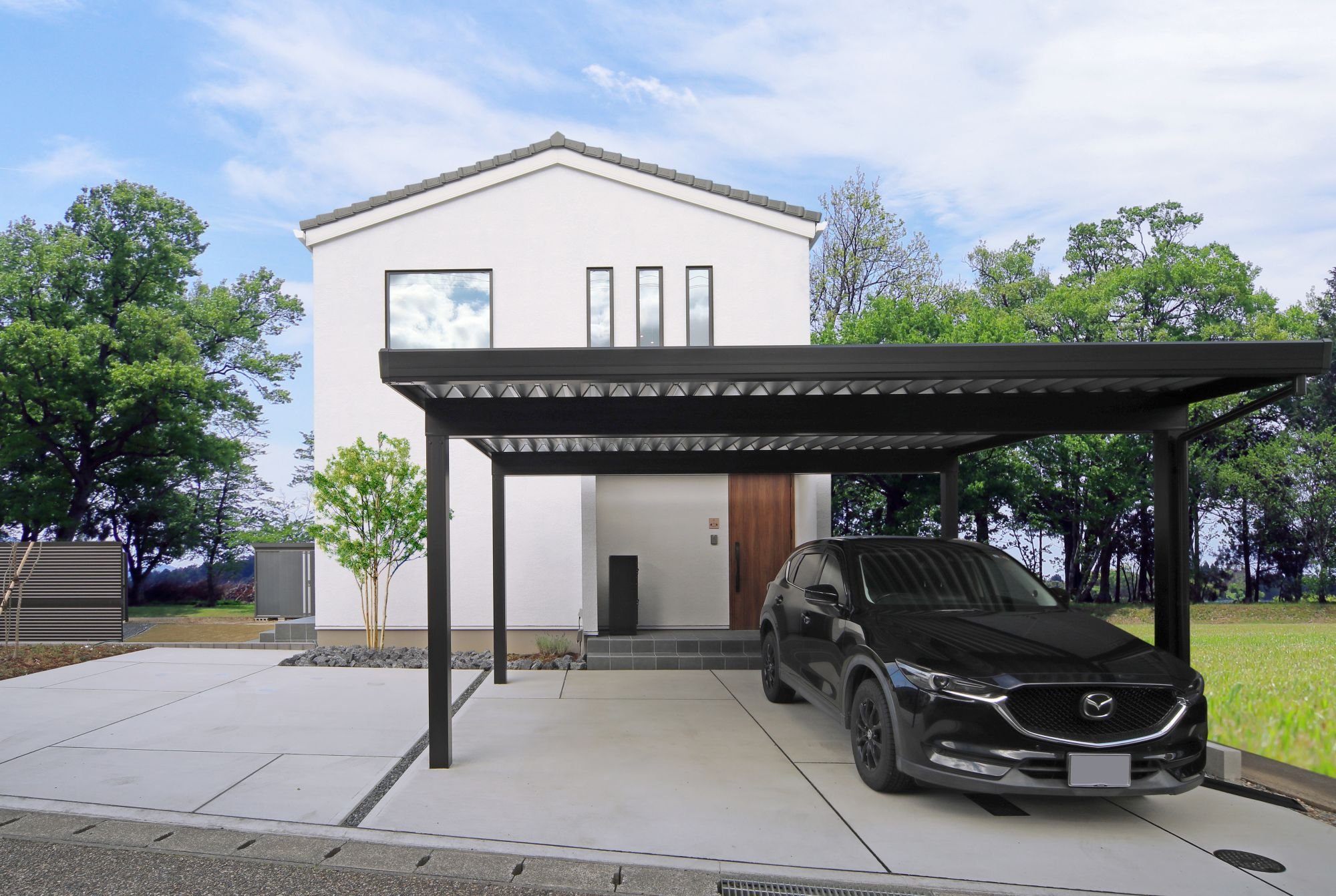 ブラックのカーポートが全体をキリッと引き締め、重厚感をプラスしています。
