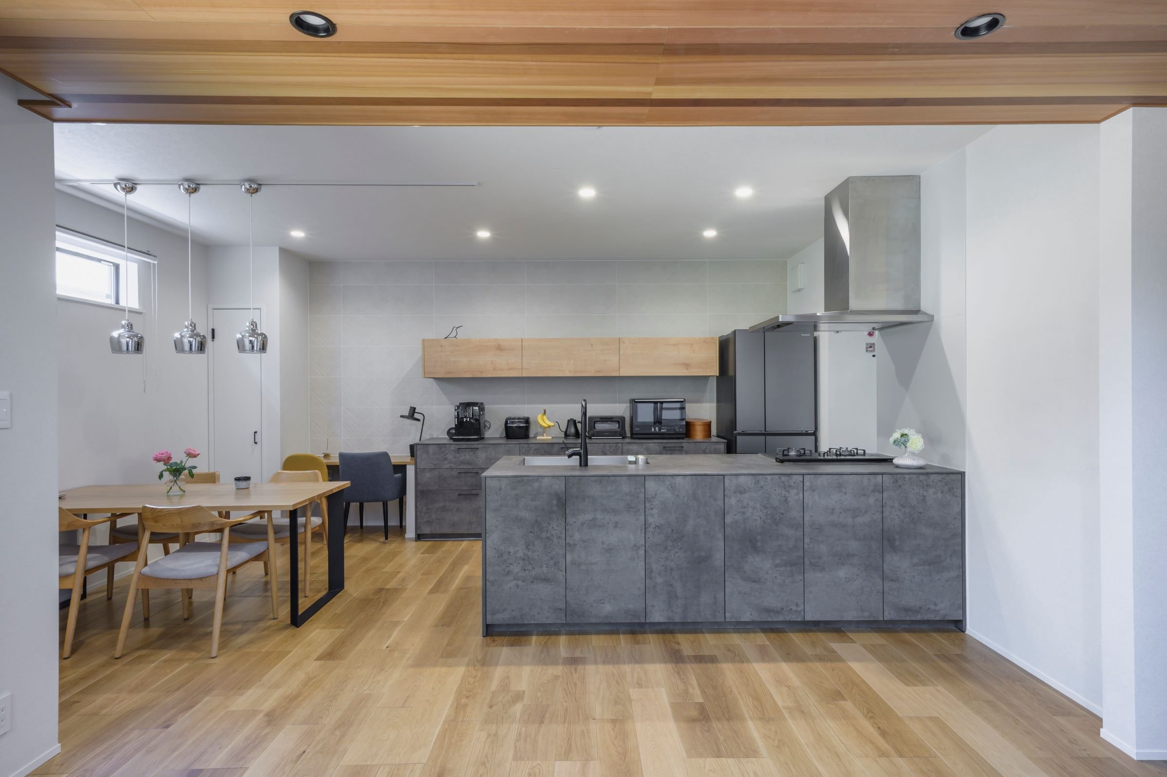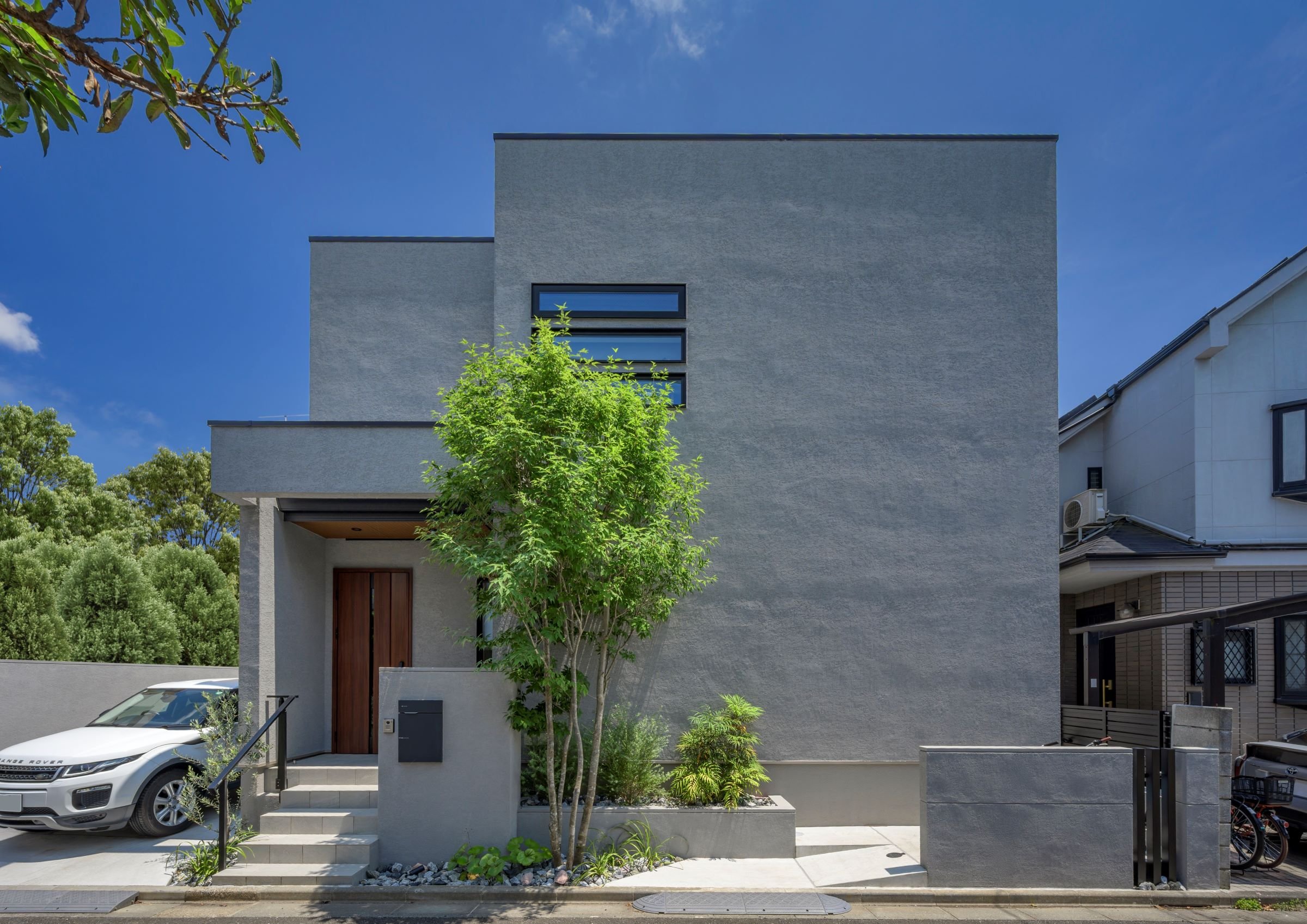 存在感のあるスクエアデザインの外観はエッジが効いて印象に残る佇まいに。室内はグレーとホワイトと木調色が巧みに組み合わされて、表情豊かな空間となった。末長く飽きることのない、上品な美しさと温もりが漂う住まいだ。