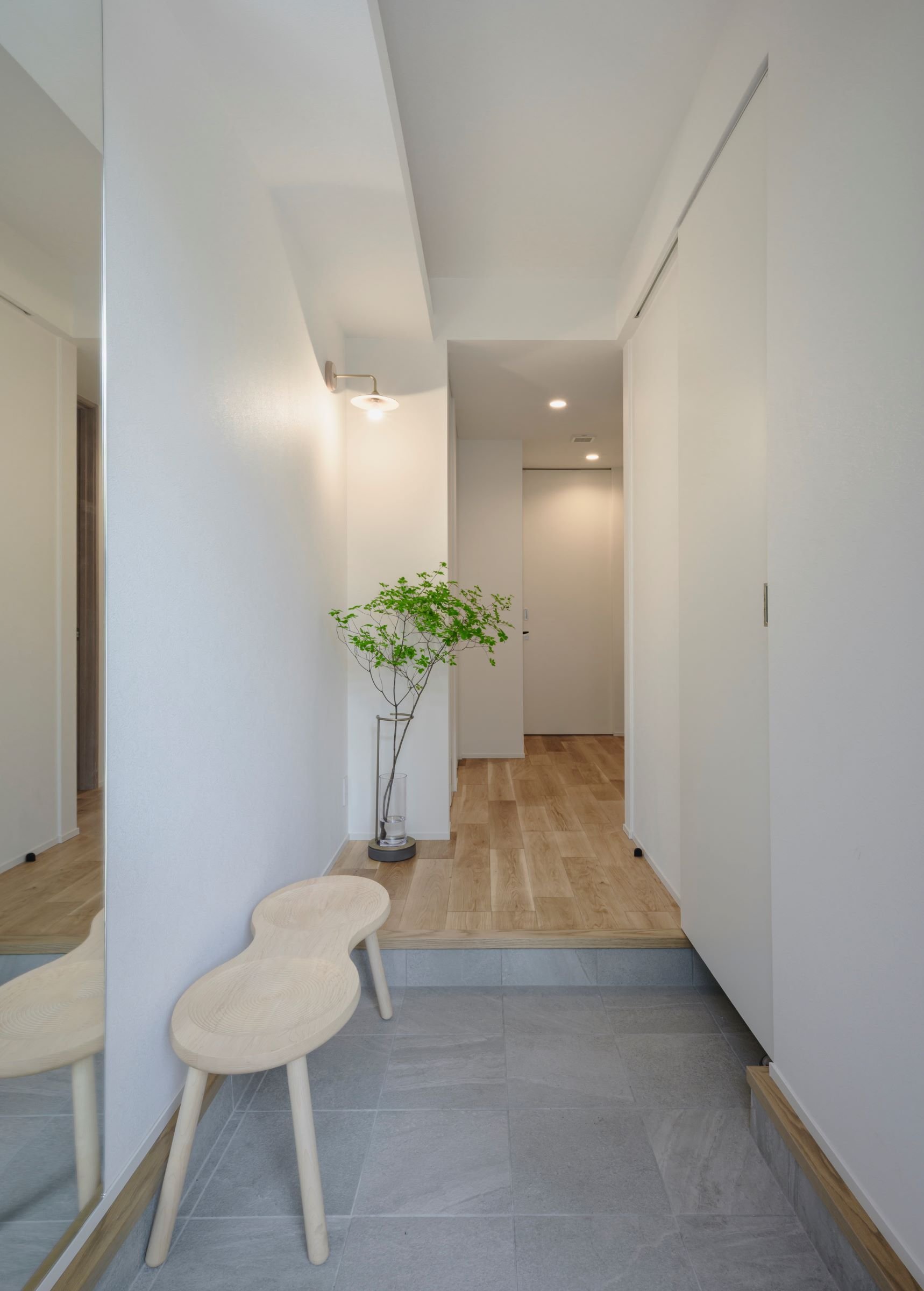 壁、天井を白いクロスで仕上げ、隣接するシューズクロークの引き戸も同系色でそろえて見た目にもすっきりと。グレーのタイルの土間に置かれた白木のベンチが心和ませてくれる。