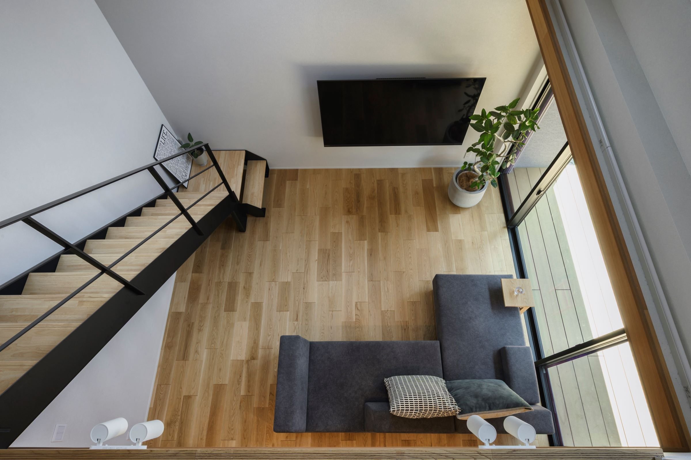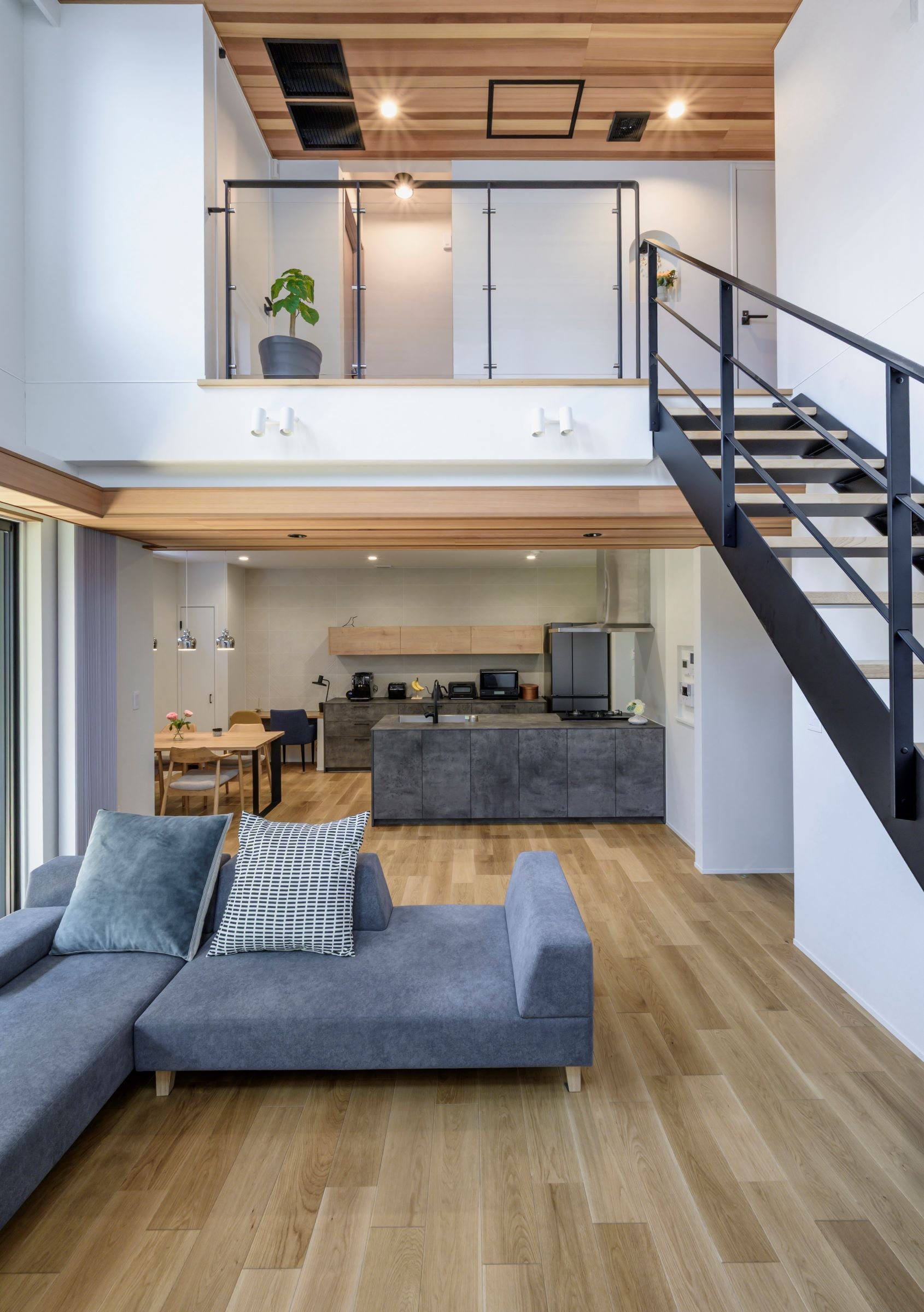 1階は南に面してリビングとダイニングキッチンをゆったりと配置。リビングは階段スペースを取り込み、吹き抜けも一体化させて開放的な空間に。