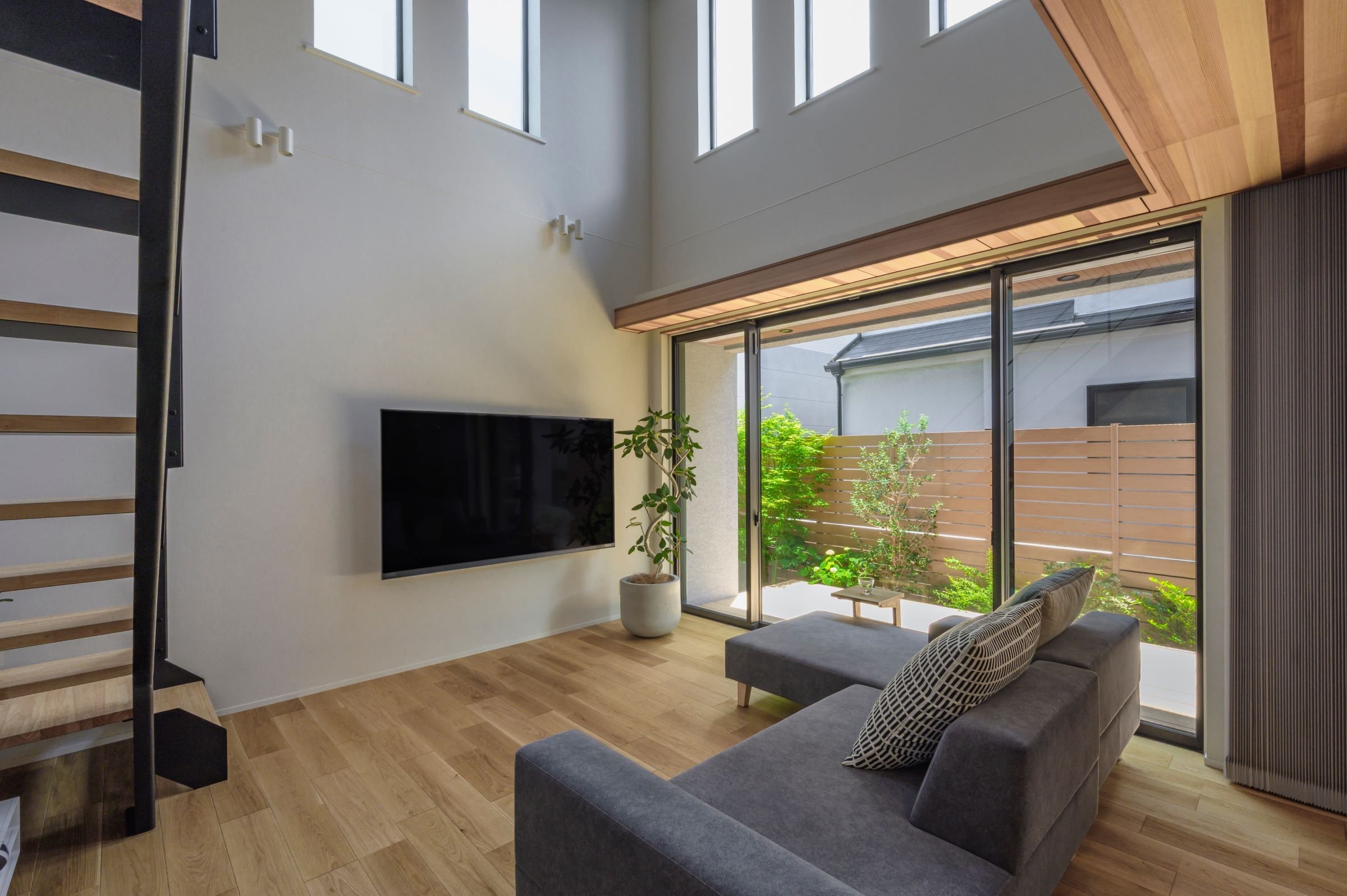 リビングの南には、天井直結の開口を設け、中央に大きなフィクス窓、左右にテラス窓を設置。視界を大きく確保し、庭の景観を広々と取り込んでいる。