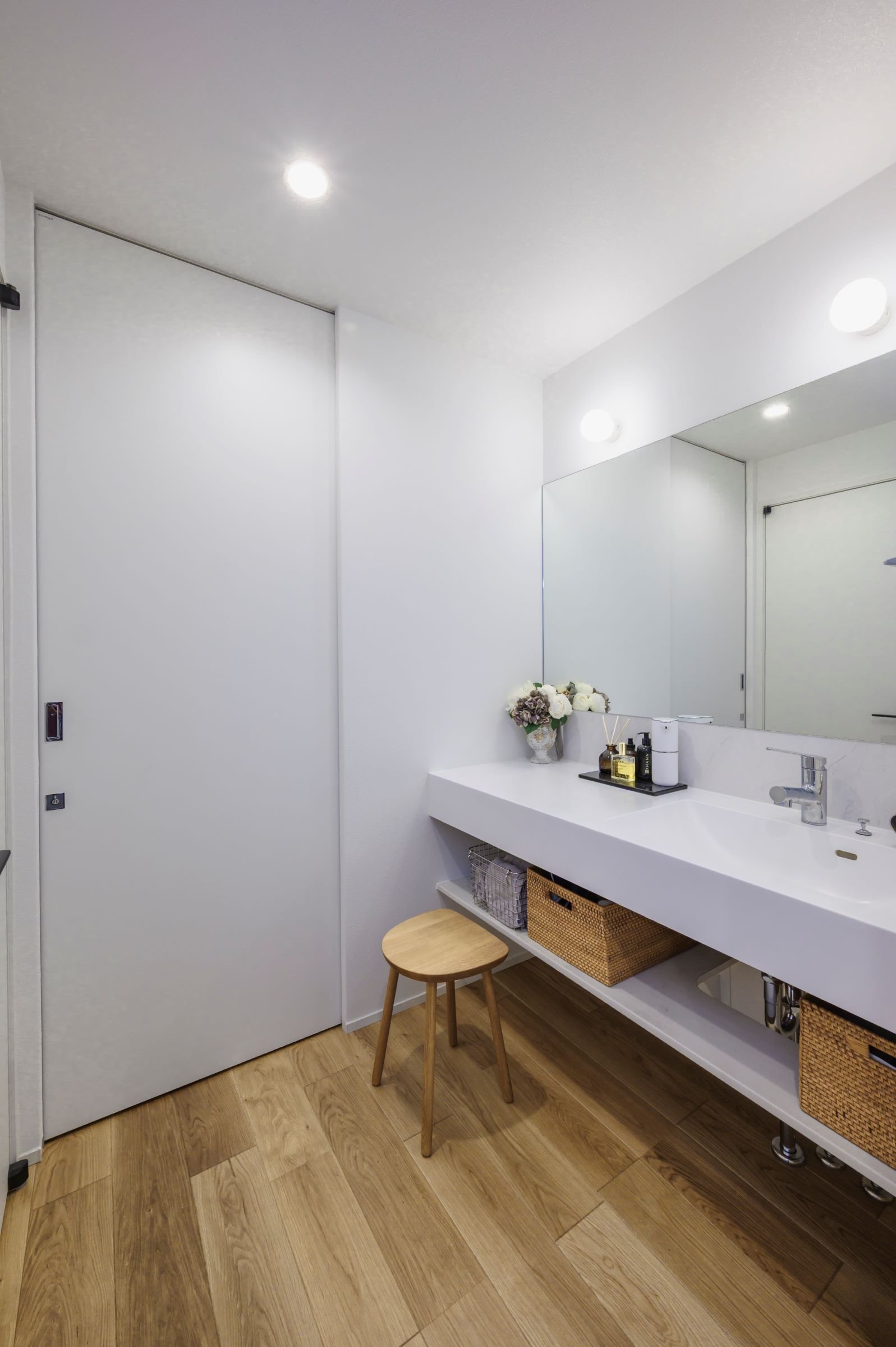 洗面室とユーティリティとはハイドアの引き戸で仕切り使い勝手を高めている
