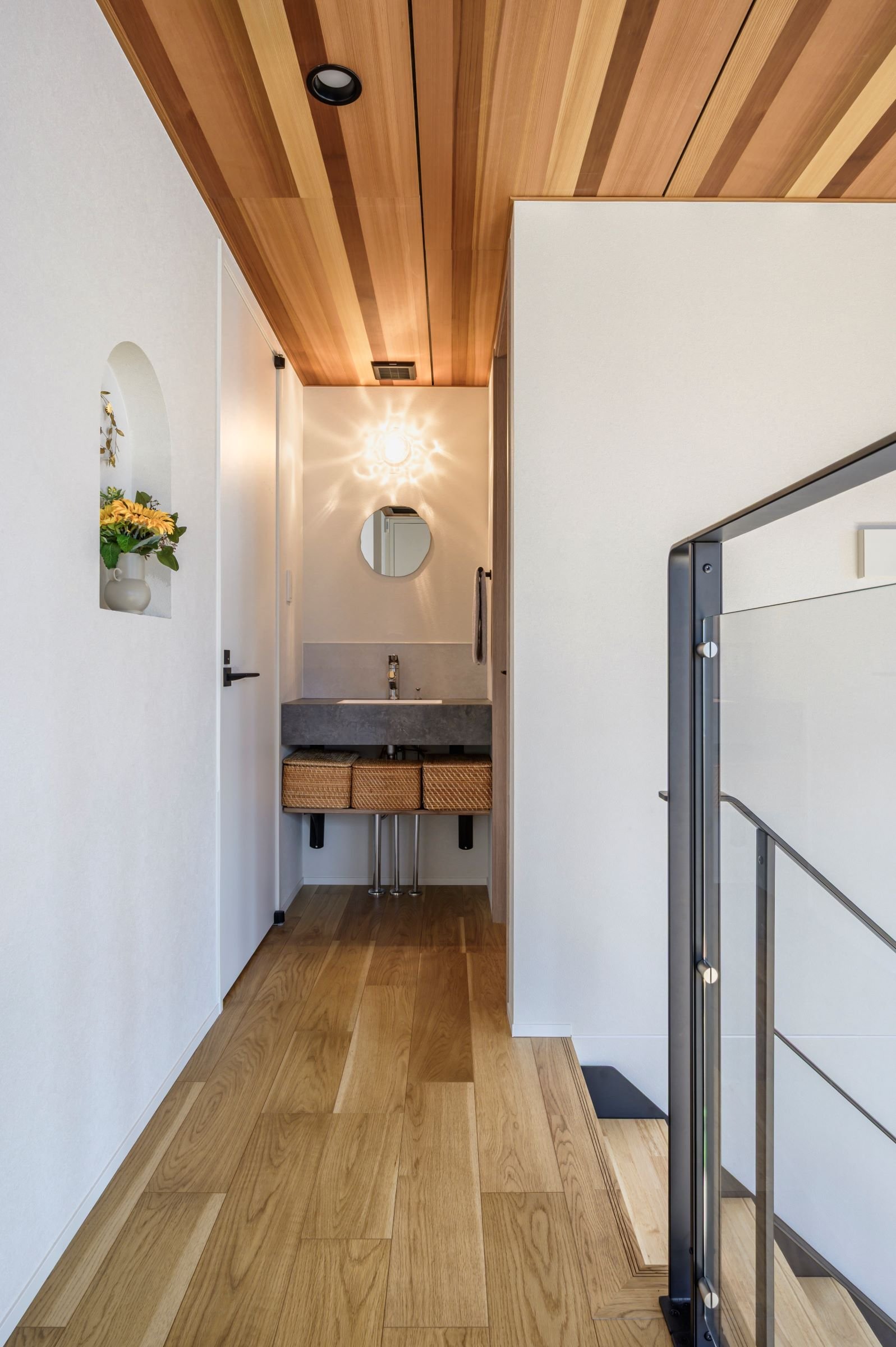吹き抜けに面した2階通路部分には正面に手洗いコーナーを設置。各個室からも使いやすく、壁には飾り棚のニッチを用意して、日々の生活動線に潤いをもたらした。