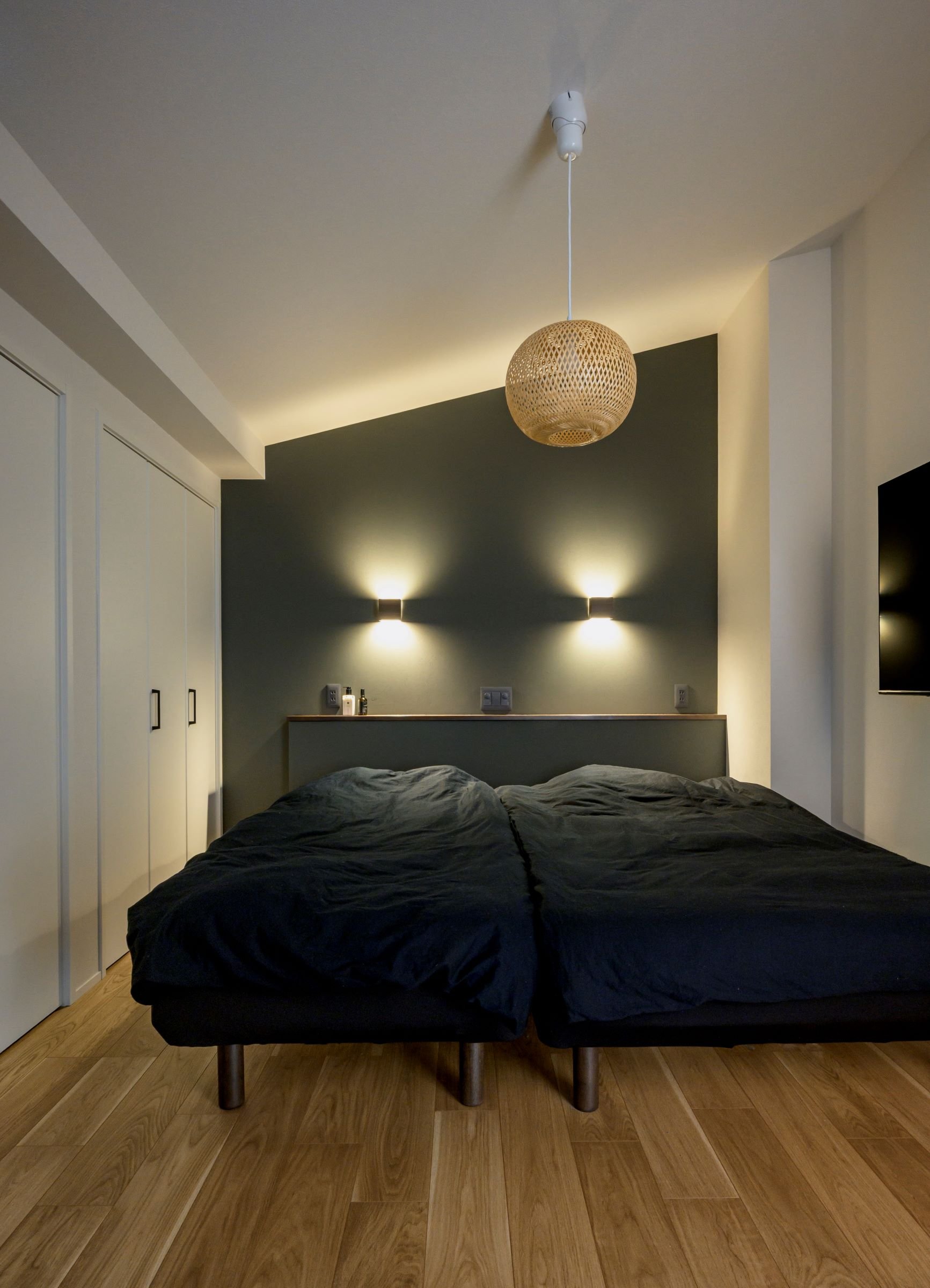 北側斜線の屋根勾配をそのまま生かした主寝室は、正面の壁をアボカド色のアクセントクロスに。上下に光を拡散するブラケットにより美しい光と影のコントラストが生まれ、空間に奥行きをもたらしている。