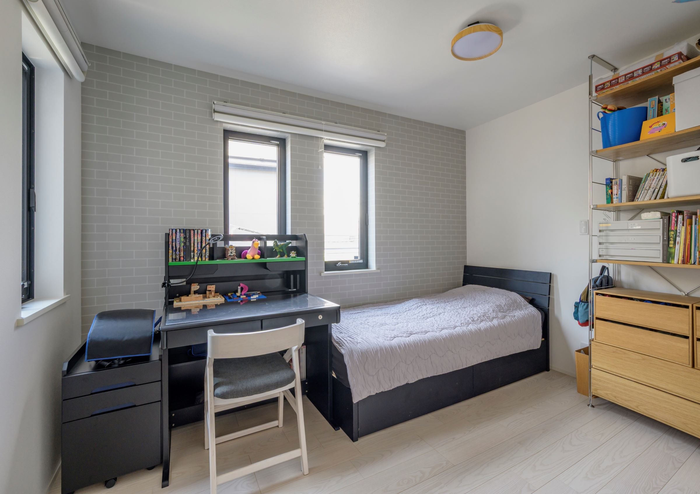 子ども部屋は約5畳強。家具が配置しやすいように窓は腰高に配置。アッシュホワイトの突き板フローリングに明るめのグレー系の内装にまとめている。