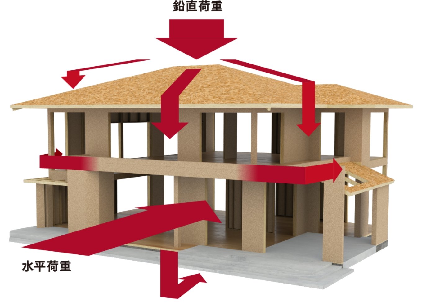 モノコック構造は、基本となる枠組みと、床・壁・屋根を6つの面として建物を支える強靭な構造のこと。高い強度と揺れの抑制が求められる航空機や自動車ボディの技術が活かされています。この剛性の高い構造が地震の揺れを受け止めて分散し、建物全体で抵抗することで優れた耐震性能を発揮します。