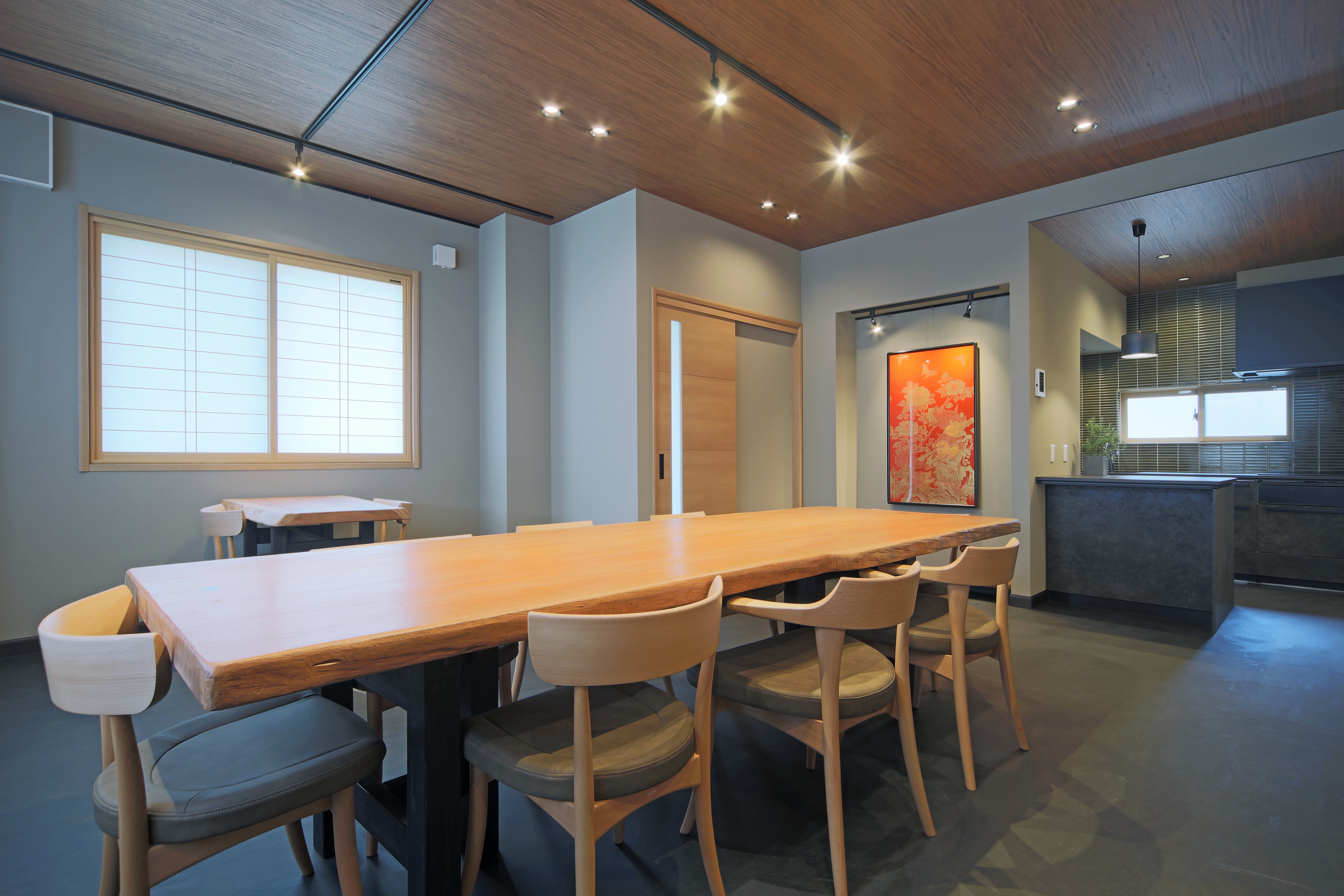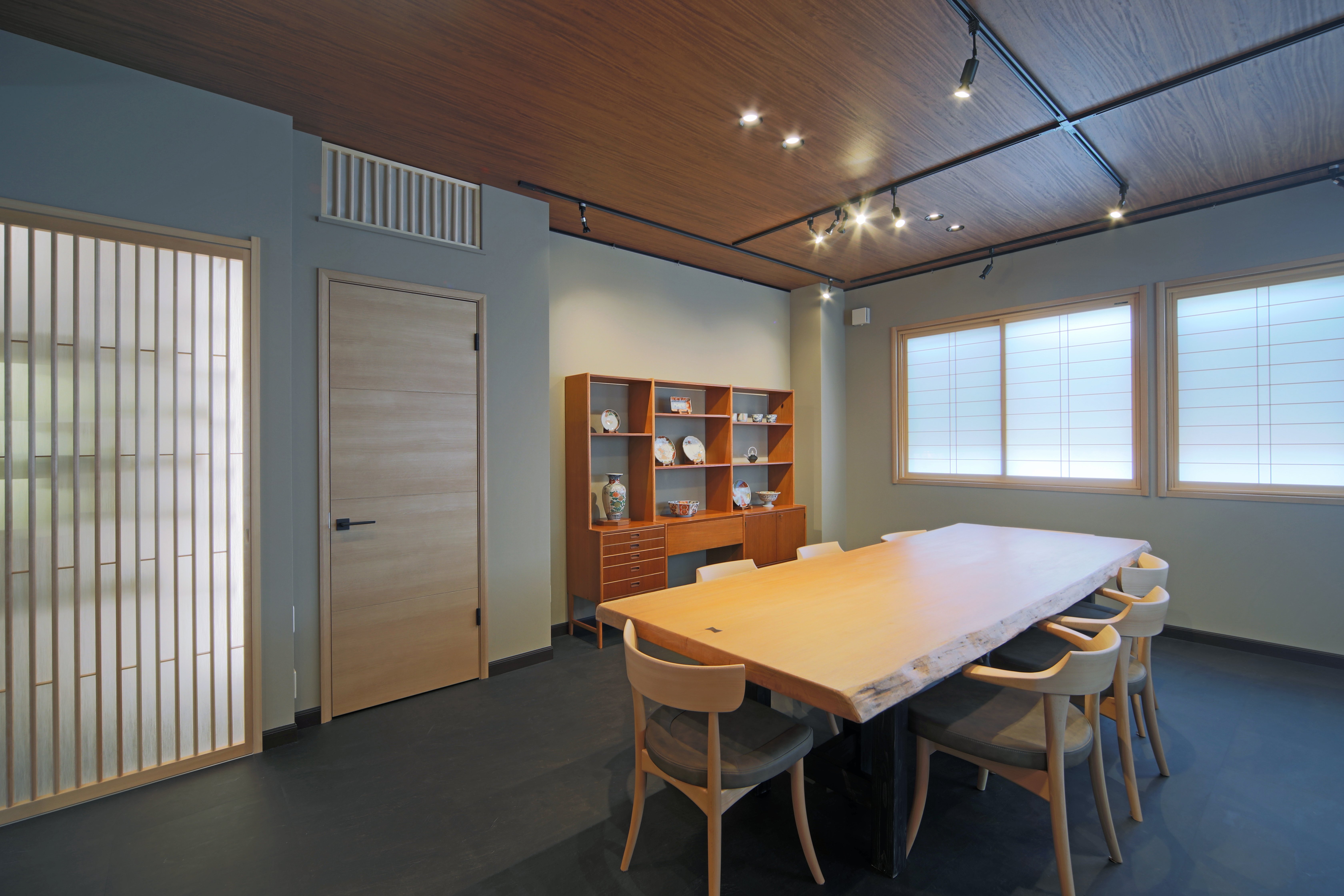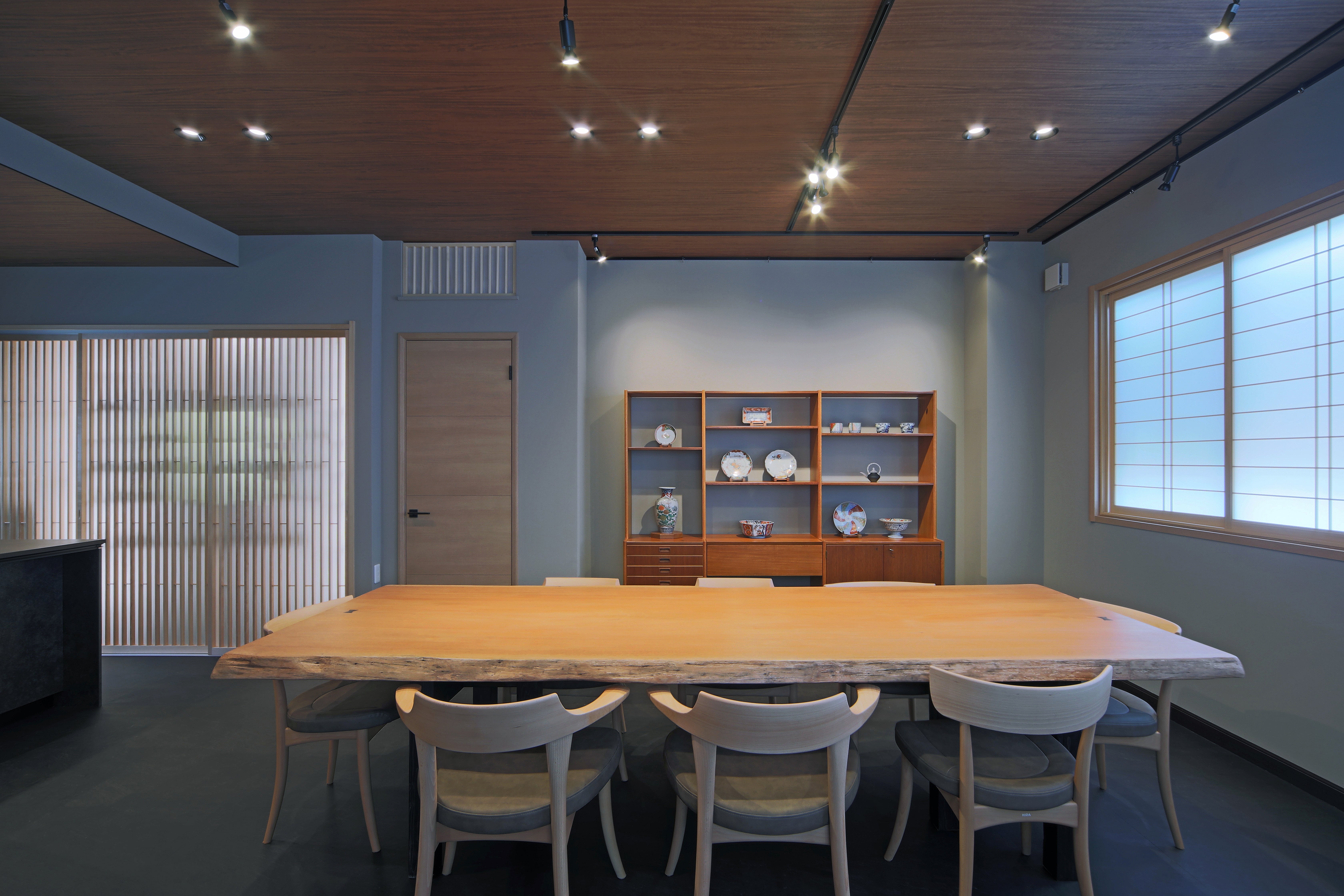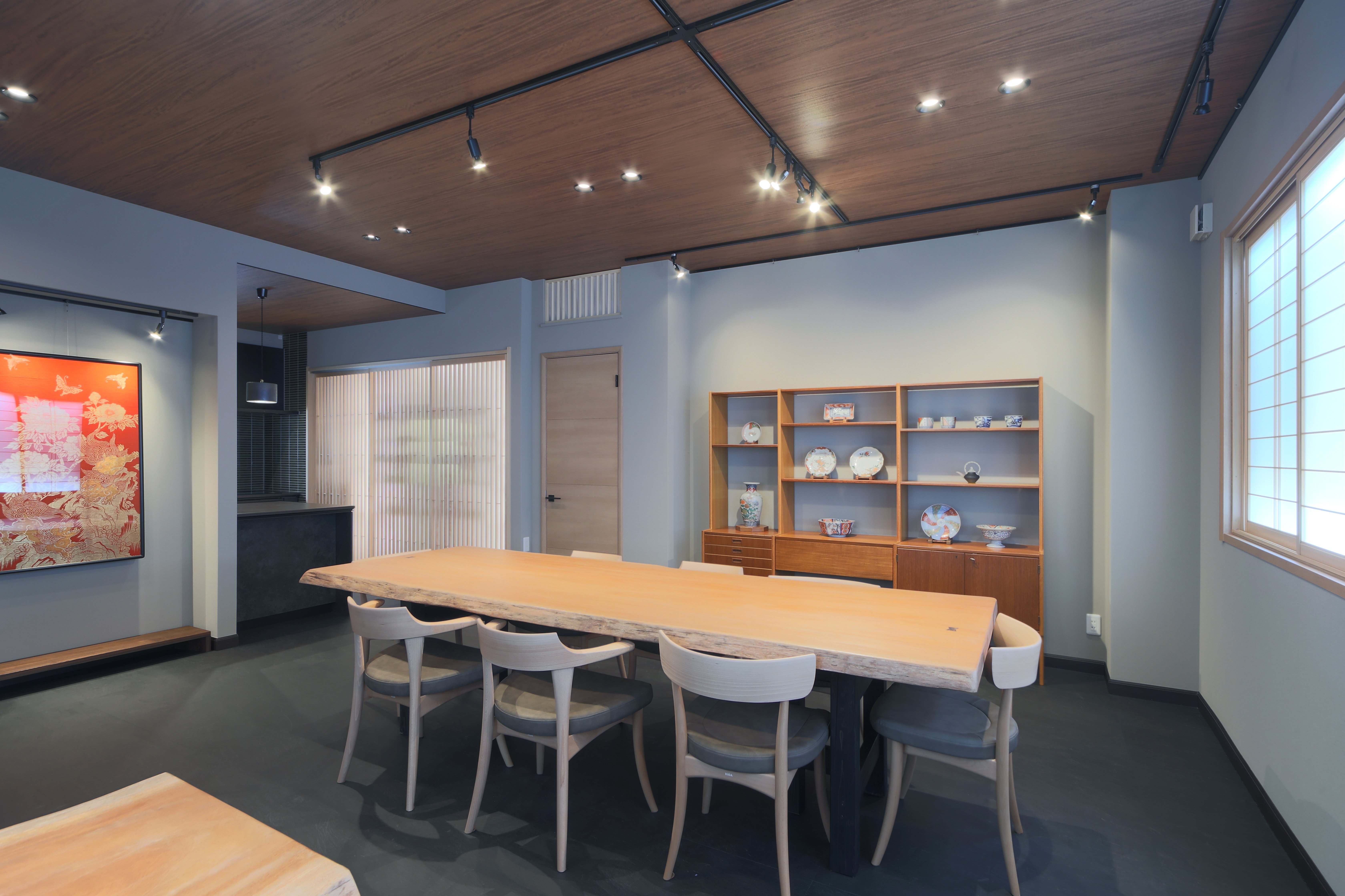 インテリアは和モダンテイストとし、一枚板のテーブルと古伊万里の焼き物がインテリアのアクセントとなっています。