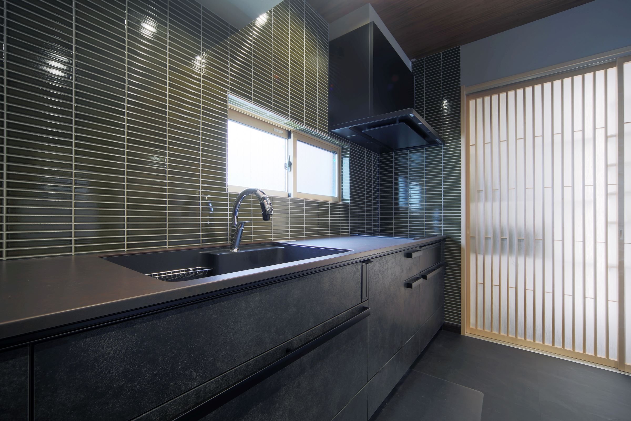 キッチンは和の焼きものらしいボーダーのタイルを使いました。